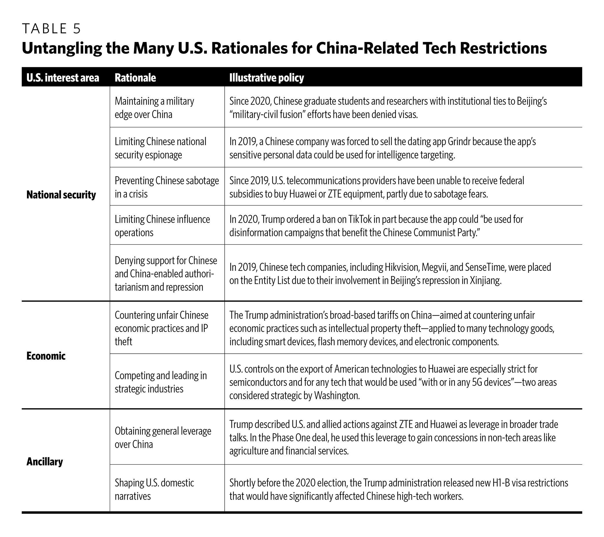 This step-by-step process demonstrates several points that bolster the case for a centrist approach. First, the most strategically significant technologies (like 5G telecommunications equipment and semiconductors) are few in number and already subject to strong U.S. government controls. A handful of other technology areas may need tighter China-oriented restrictions—for example, drone swarms, the U.S. bulk power system, and technologies sold to Xinjiang. Yet certain China-focused controls seem counterproductive in a number of other high-profile areas, such as geolocation data, social media platforms, and consumer devices like smartphones. Second, official U.S. policy goals remain dangerously vague and open-ended. To avoid costly and quixotic technology wars, Washington must publicly clarify its vision for the global tech trade and set more achievable ambitions for countering techno-authoritarianism, maintaining a military edge over China, and preventing Chinese espionage, sabotage, and influence operations. Third, offensive policies have the greatest long-term potential for strengthening U.S. technology leadership, competitiveness, and resilience—and thereby achieving security and prosperity. Although technology restrictions are the primary subject of this report, they cannot be the primary focus of policymakers.